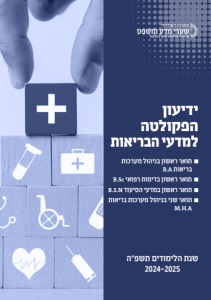 2 תוכן עניינים דבר דקאן הפקולטה למדעי הבריאות לשנת תשפ"ה ................................ 4 ................................... רקע ומגמות ................................ ................................ ................................ 5 ..................... מוסדות המרכז ובית הספר ל ניהול מערכות בריאות ................................ 6 .................................... הסגל האקדמי ................................ ................................ ................................ 7 .................. מרצי סגל פנים ................................ ................................ ................................ 7 .................. מרצי סגל חוץ ................................ ................................ ................................ 7 ................... מורות לאנגלית ................................ ................................ ................................ 7 .................. הסגל המנהלי ................................ ................................ ................................ 8 ................... דקאנט הסטודנטים ................................ ................................ ................................ 9 ........... תקנון בחינות, ציונים ותנאי מעבר ................................ ................................ 10......................... תקנון משמעת לסטודנטים ................................ ................................ 18.................................. תקנון הספריה ................................ ................................ ................................ 25................. תקנון שכר לימוד ................................ ................................ ................................ 28.............. חוק זכויות הסטודנט, התשס"ז- 2007 ................................ ................................ 37.................... לוח זמנים אקדמי לשנ ת הלימודים תשפ"ה 2024 – 2025 ................................ ........................... 48 החוג ל ניהול מערכות בריאות ................................ 49 .................................... דבר ראש החוג לניהול מערכות בריאות לשנת תשפ"ה ................................ 50................................ דבר ראשת החוג ל תואר שני ניהול מערכות בריאות לשנת תשפ"ה ................................ 51.................. תקנון הלימודים בבית הספר לניהול מערכות בריאות ................................ 52................................. תואר בוגר בניהול מערכות בריאות ................................ 62 ............................. תכנית ההוראה לקבלת תואר בוגר ב ניהול מערכות בריאות ................................ 63.......................... תכנית הלימודים לשנת תשפ"ה ................................ ................................ 64........................... קורסי חובה ................................ ................................ ................................ 64.................... קורסי בחירה ................................ ................................ ................................ 65................... סמינריונים ................................ ................................ ................................ 67..................... תיאור הקורסים ................................ ................................ ................................ 69............... קורסי חובה שנה א' ................................ ................................ ................................ 70.......... קורסי חובה שנה ב' ................................ ................................ ................................ 79........... קורסי חובה שנה ג' ................................ ................................ ................................ 90........... קורסי בחירה ................................ ................................ ................................ 99................... סמינריונים עיוניים ................................ ................................ ................................ 115 ......... סמינריונים מחקריים ................................ ................................ ................................ ...... 123 תואר מוסמך ב ניהול מערכ ות בריאות ................................ ........................ 130 תכנית ההוראה לקבלת תואר מוסמך ב ניהול מערכות בריאות ................................ ..................... 131 תכנית הלימודים לשנת תשפ"ה ................................ ................................ 132 ......................... תיאור הקורסים – קורסי חובה ................................ ................................ .......................... 135