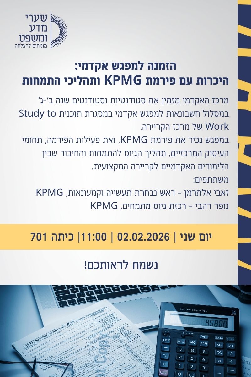 במסגרת תוכנית Study2Work מרכז קריירה מארח את הפירמה- KPMG, במפגש יתארחו שותף בכיר ונציגת HR, אשר ידברו על תהליך גיוס להתמחות והחיבור בין אקדמיה לקריירה.